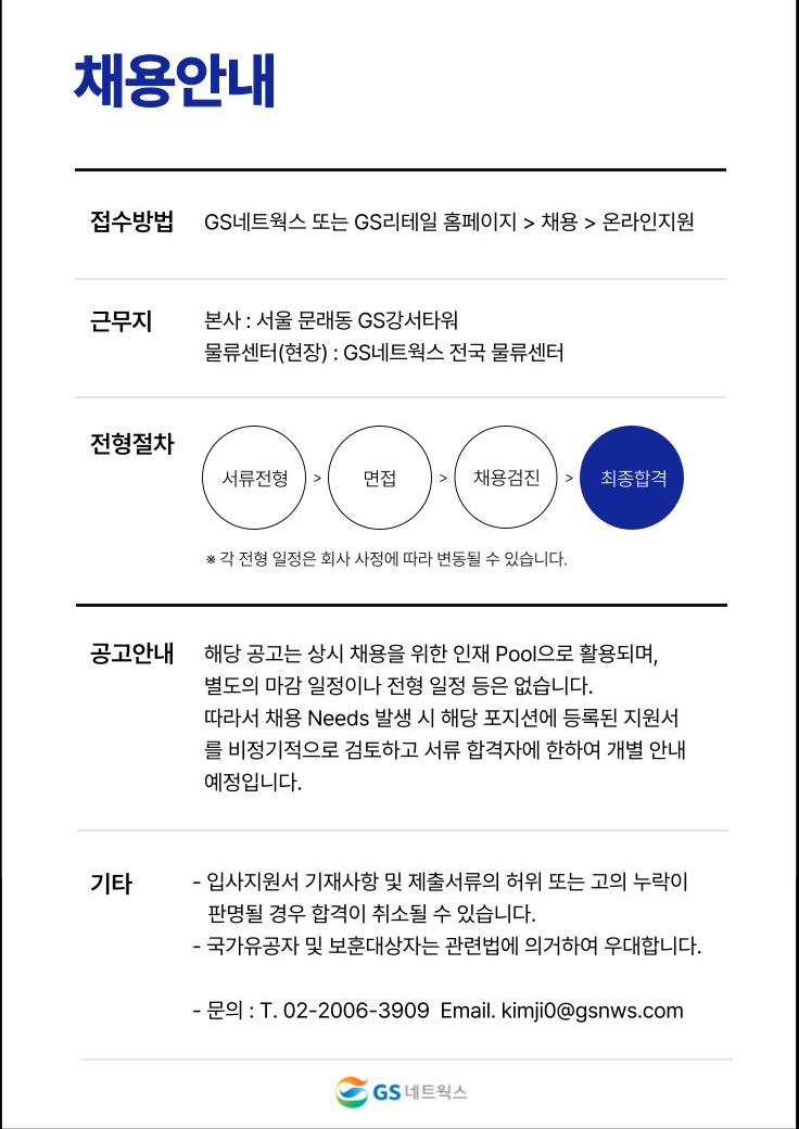 카테고리 없음 [GS네트웍스] '25년 2분기 경력사원 수시 채용 by okfreelife 2025. 4. 24. gs네트웍스 '25년 2분기 경력사원 수시 채용 모집기간 : 25.04.09 ~ 25.06.30 23:59 까지 모집인원 : 0명 모집구분 : 경력 잏반채용 지원하기 : https://gsretail.recruiter.co.kr/career/jobs/66234 공유하기 게시글 관리 okfreelife 님의 블로그